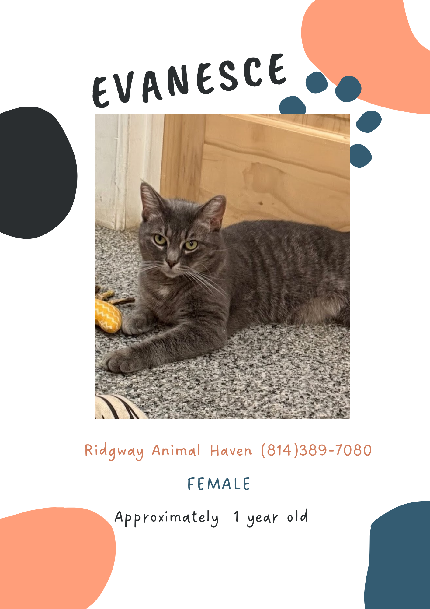 Evanesce is a sweet young lady. She loves snuggles and running around the shelter chasing all the toys..