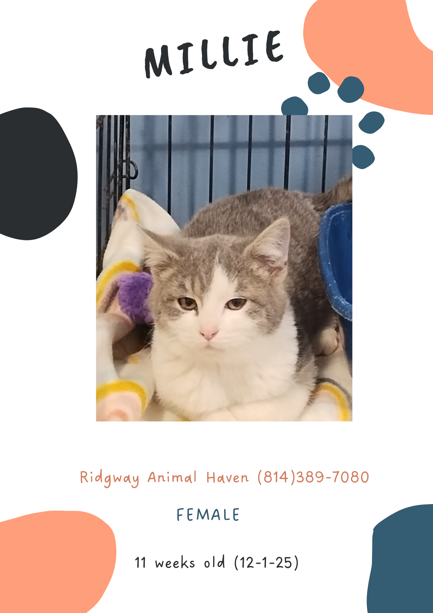 Pearl has a silvery grey coat with a white underside, She came to us as a stray. Pearl would do best in a home without a lot of chaos. She is good with other adult cats but just not a fan of the kittens or high energy.