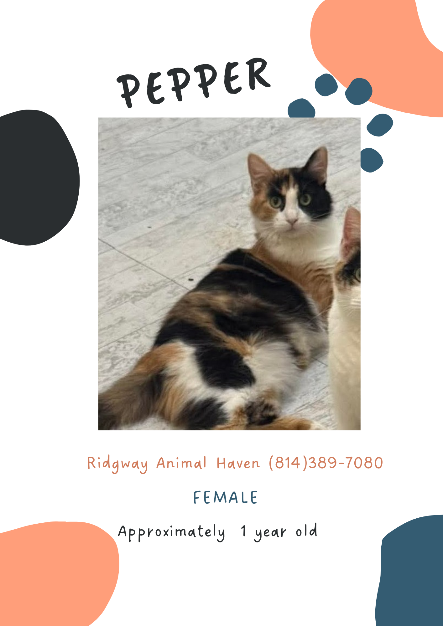 Pepper came in with her babies, she has since been fixed, and is up to date on her shots. she is a little on the skittish side but has come a long way it wont take her long to warm up to a new human .