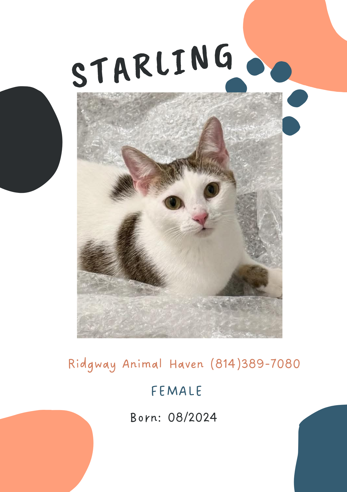 Starling is very cuddly and loveable, her favorite things to do are zooming around in the kitty hut and tunnels, and chasing the mouse toys ..