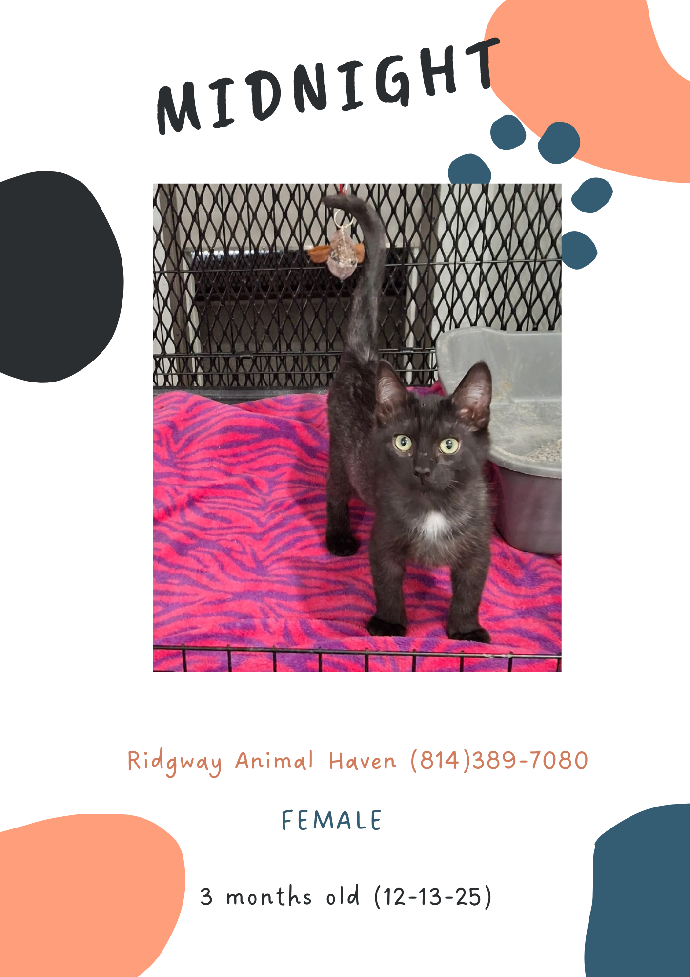 Midnight is a graceful, independant, yet affectionate kitty with lots of playful energy. she would make a fierce hunter