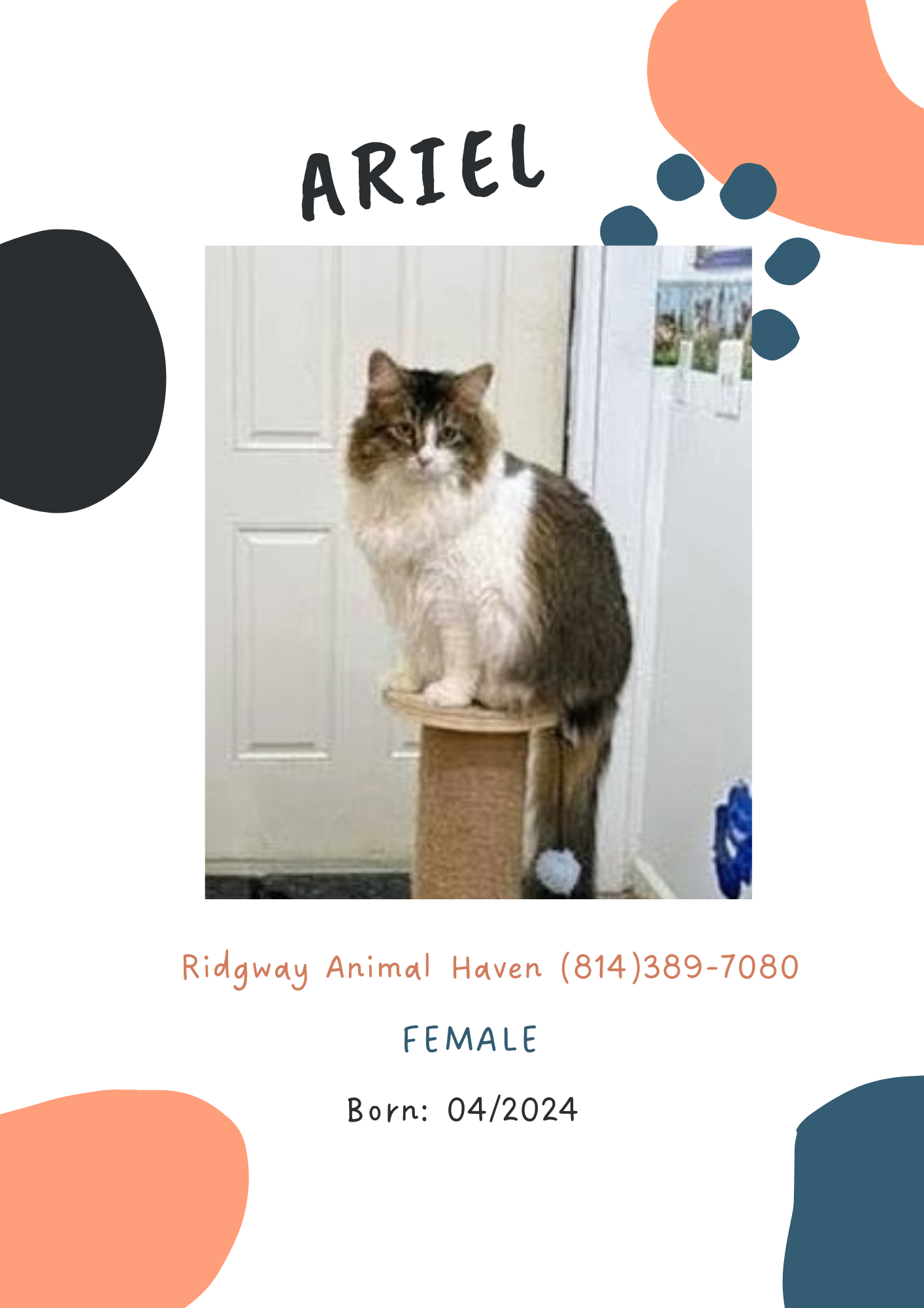 Zoey is absolutely adorable. She does well with all the cats here at the shelter. She is so soft, fluffy, and cuddly. She loves to play with all the toys here at the shelter.